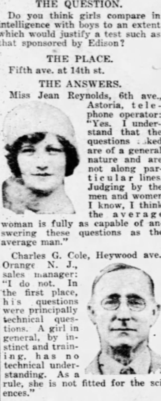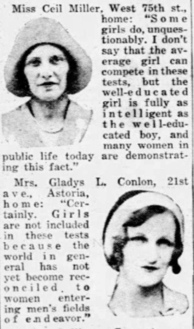 Inquiring Photographer: “Do you think girls compare in intelligence with boys to an extent which would justify a test such as that sponsored by Edison?”September 4, 1930
