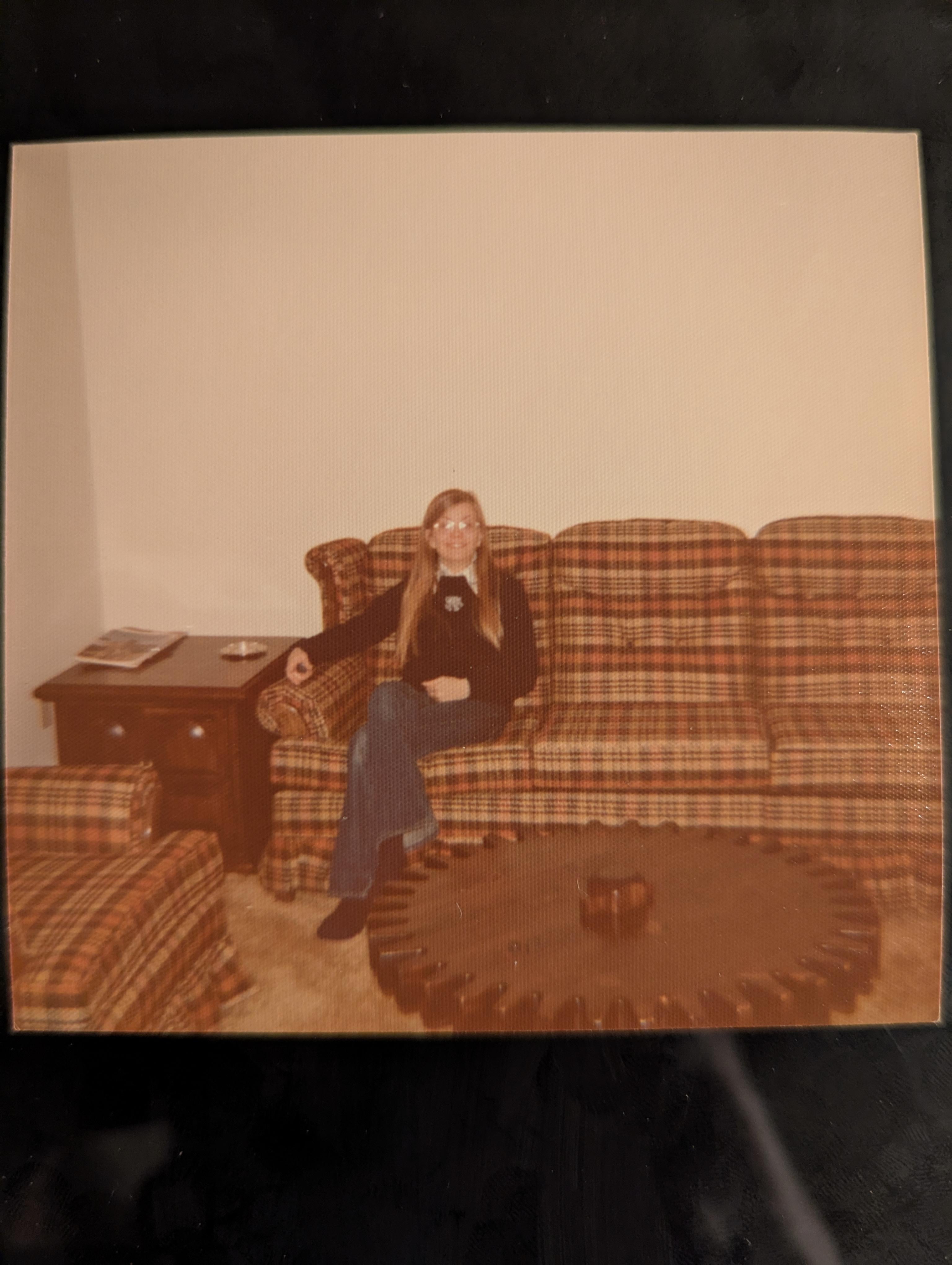 Taken in their first apartment after getting married. The cog table was from Ethan Allen but they found it at an outlet store. There were two tables and my dad always regretted he didn’t buy both so he could mesh them together, because the top does spin.