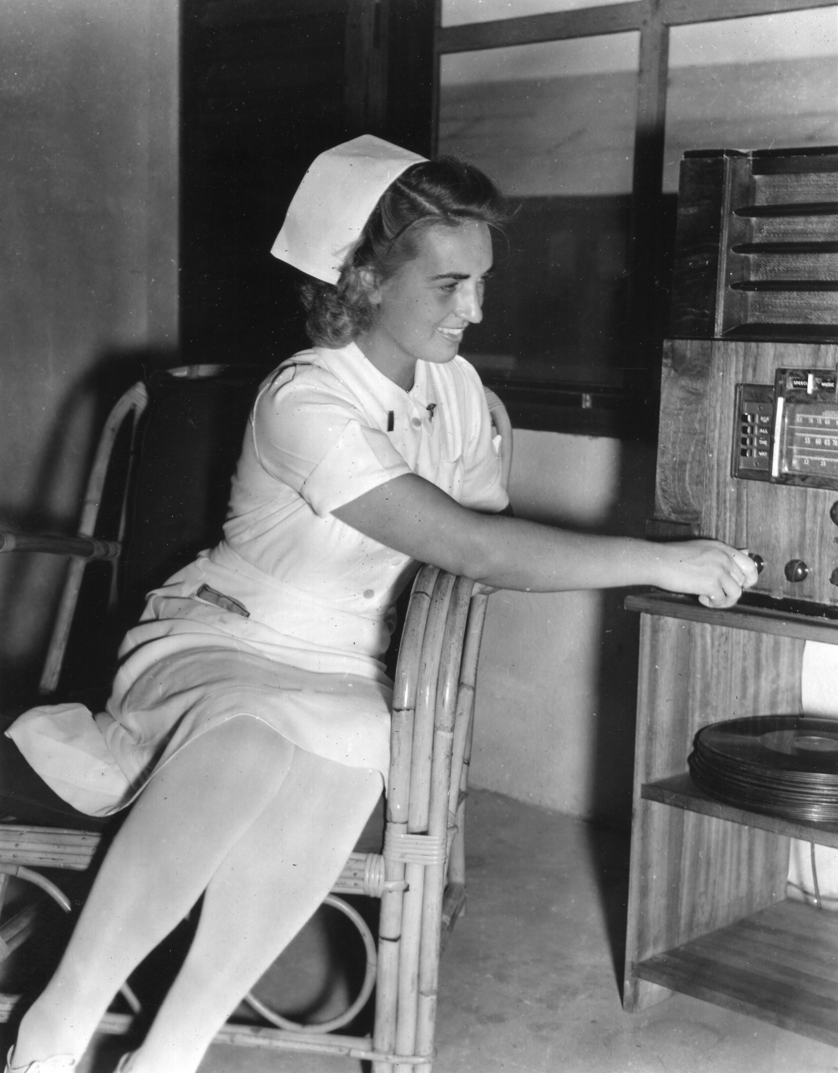 c.1943. Nurse listening to a radio during WWII, possibly North Africa.