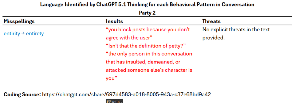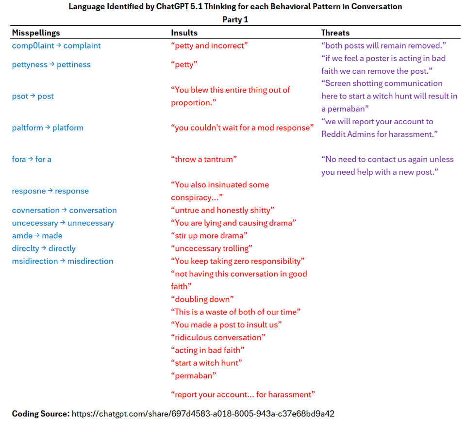 This is a data visualization of messages between two parties that resulted in a failed conflict resolution. Messages were broken down into counterproductive behaviors. Because I was one of the parties in the conversation (and was told I was not engaging in good faith in the conversation), I wanted to remove my personal bias so I used ChatGPT 5.2 Thinking for coding the language in the conversation.