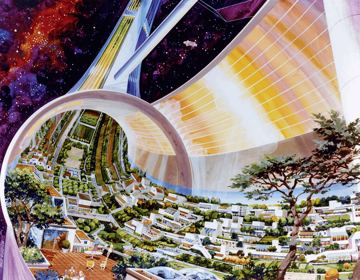 Rick Guidice made a series of famous paintings in the mid-1970s, depicting vast space colonies designed by Princeton University physics professor Gerard K. O’Neill. NASA gave tacit support to these speculative research efforts apparently .