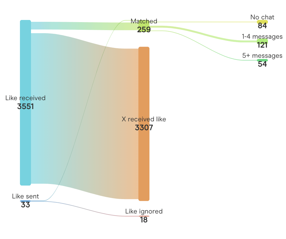 Real-Mix5523 on February 1, 2026 12:12 pm source: https://hingereport.com/ 8 first dates 3 second dates, including 1 almost-situationship and 1 (current) exclusive dating 33 likes sent → 15 matches (45.45%, ~1 in 2) 3,584 interactions (~10/day), 259 matches (7.23%) 3,551 likes received → 244 matches (6.87%)