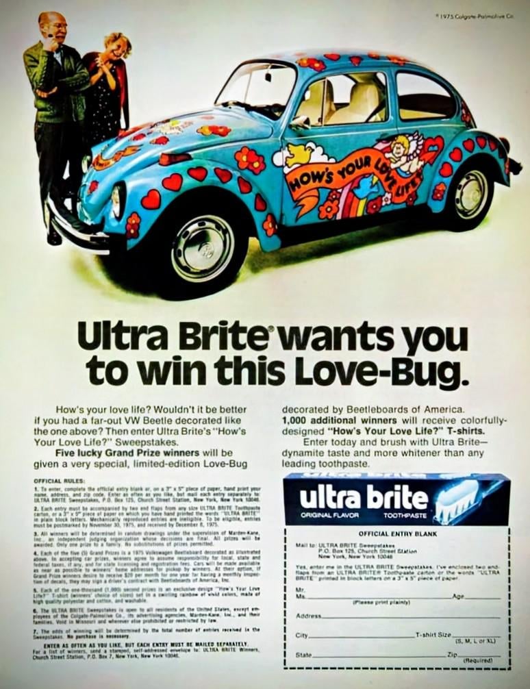 How's your love life? Wouldn't it be better if you had a far-out VW Beetle decorated like the one above? Then enter Ultra Brite's "How's Your Love Life?" Sweepstakes.
