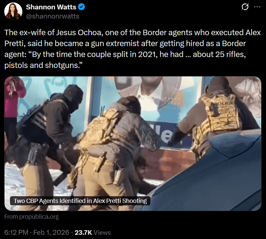 I’m shocked that an ICE agent might also be an off-the-deep-end gun nut whose obsession with violence alienated his wife, throwing him even further into right-wing radicalization.