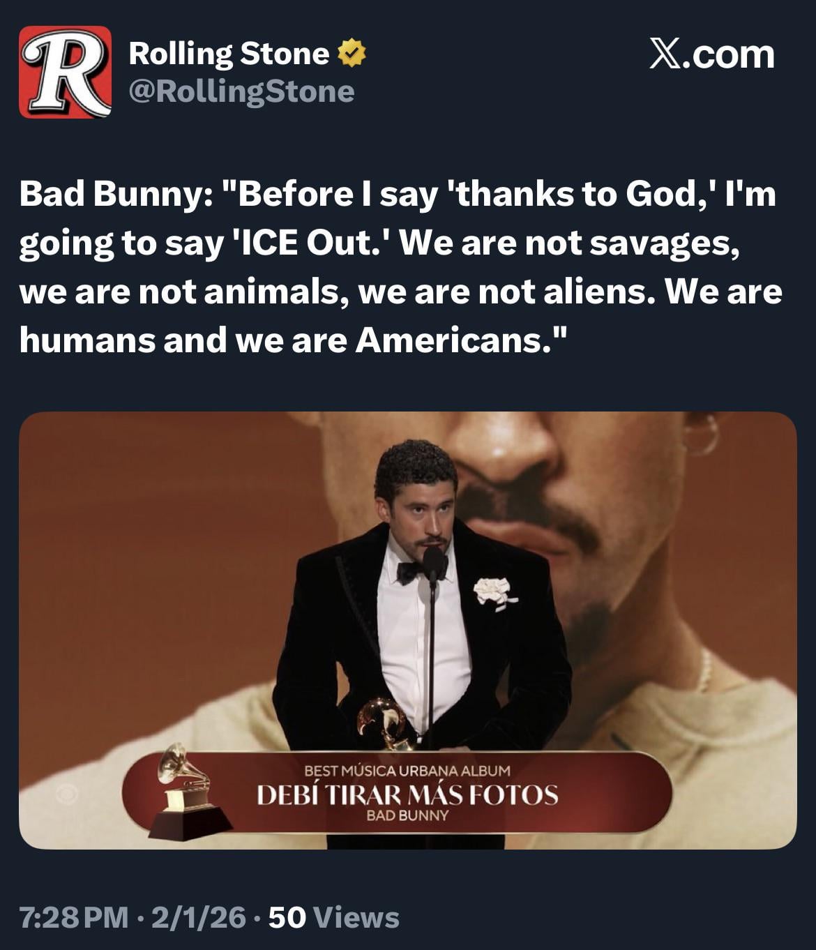 colorme1965 on February 2, 2026 2:40 am He’s under contract with the NFL. What he really wanted to say was FUCK ICE.