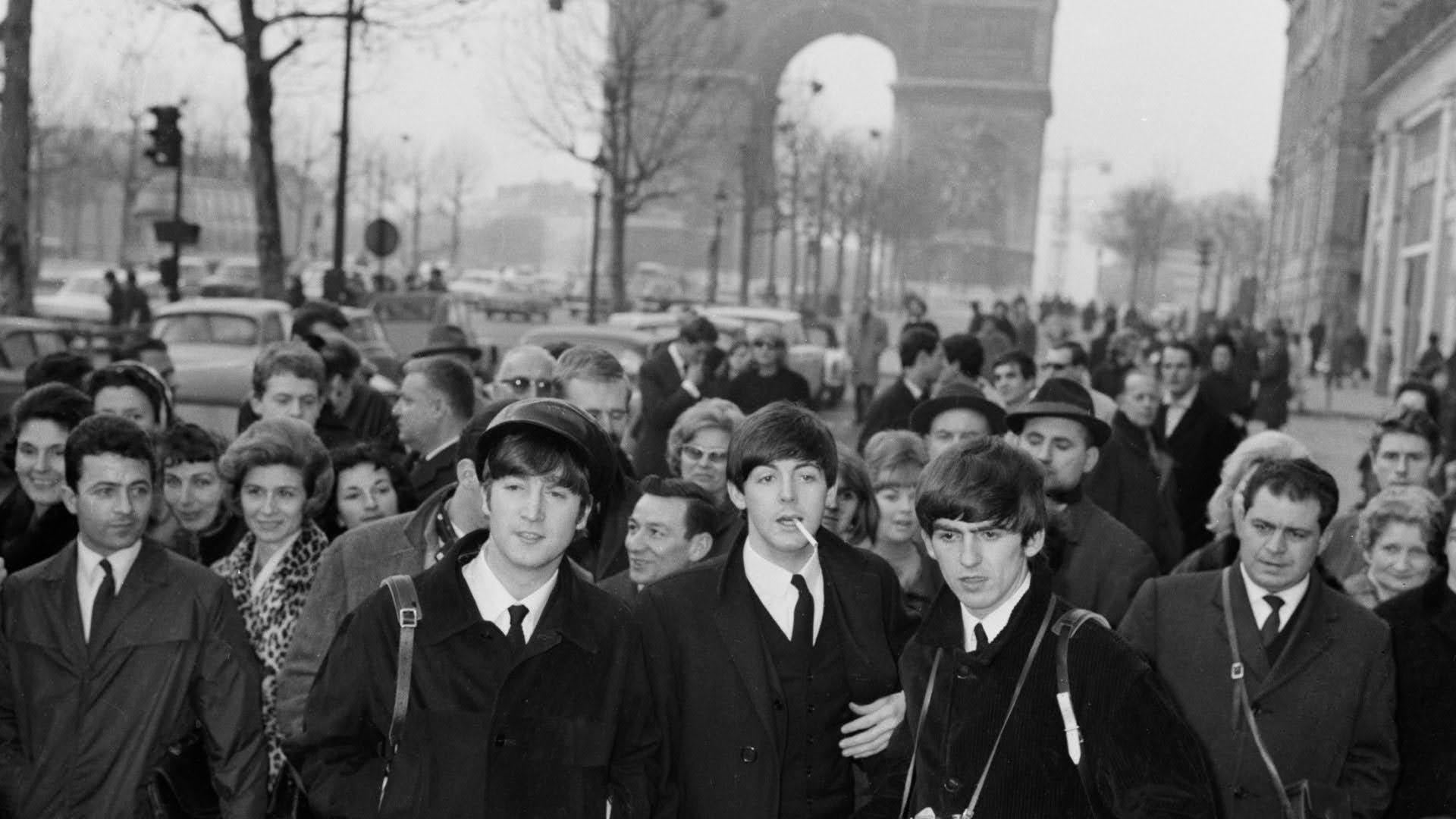 The Beatles and their entourage walking down the Champs- Elysees. (1964) [1920 × 1080]