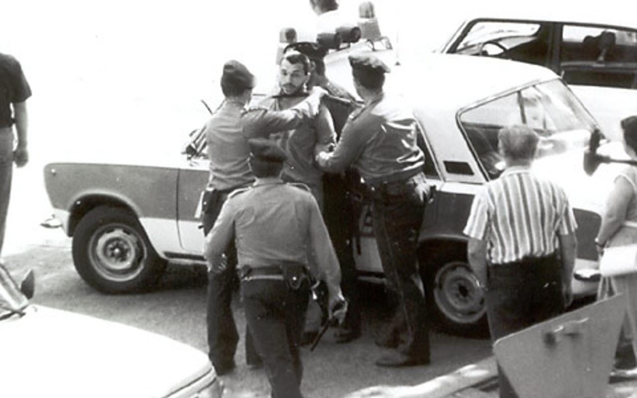Hungary, 1989 — Viktor Orbàn is beaten and forcibly restrained by police under the communist regime. The photograph captures the moment mid-struggle, with multiple uniformed officers gripping him as he resists on a public street. Bystanders and other security personnel are visible nearby, while the physical imbalance between the individual and the state authorities dominates the frame. The image freezes a brief but intense encounter between police power and civilian defiance in the final year of communist rule in Hungary.