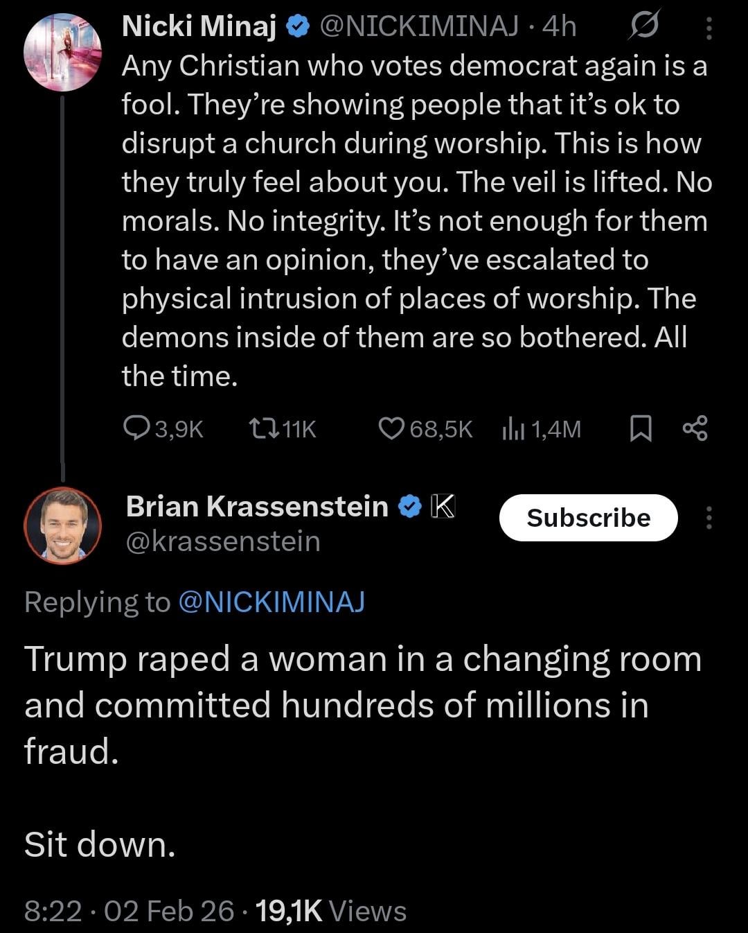 Having to listen to Nicky _Fucking_ Minaj ! Of all people! Lecture us on fucking Christian morality while stumping for Trump?!?