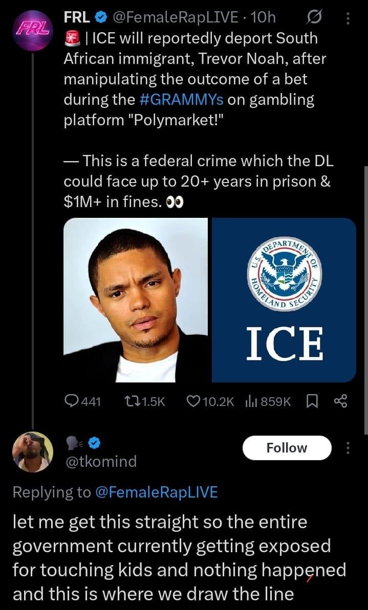 14. Also DJT jr is an active investor in those prediction markets and someone made millions off the capture of Maduro. This post seems falsified by some maga grunt whos mad Noah made a few jokes at the expense of their supreme ruler, but you know they never get mad when people on the other side are doing actual illegal things