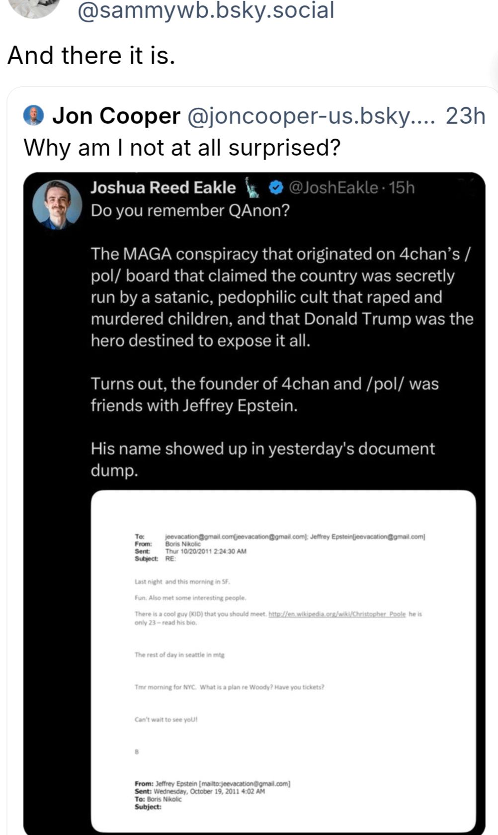 My theory was that the whole QAnon thing was these exact same people “flooding the zone” with garbage as an insurance policy, so that if everything came out as it is now, that there would be massive confusion over what’s real and what isn’t.