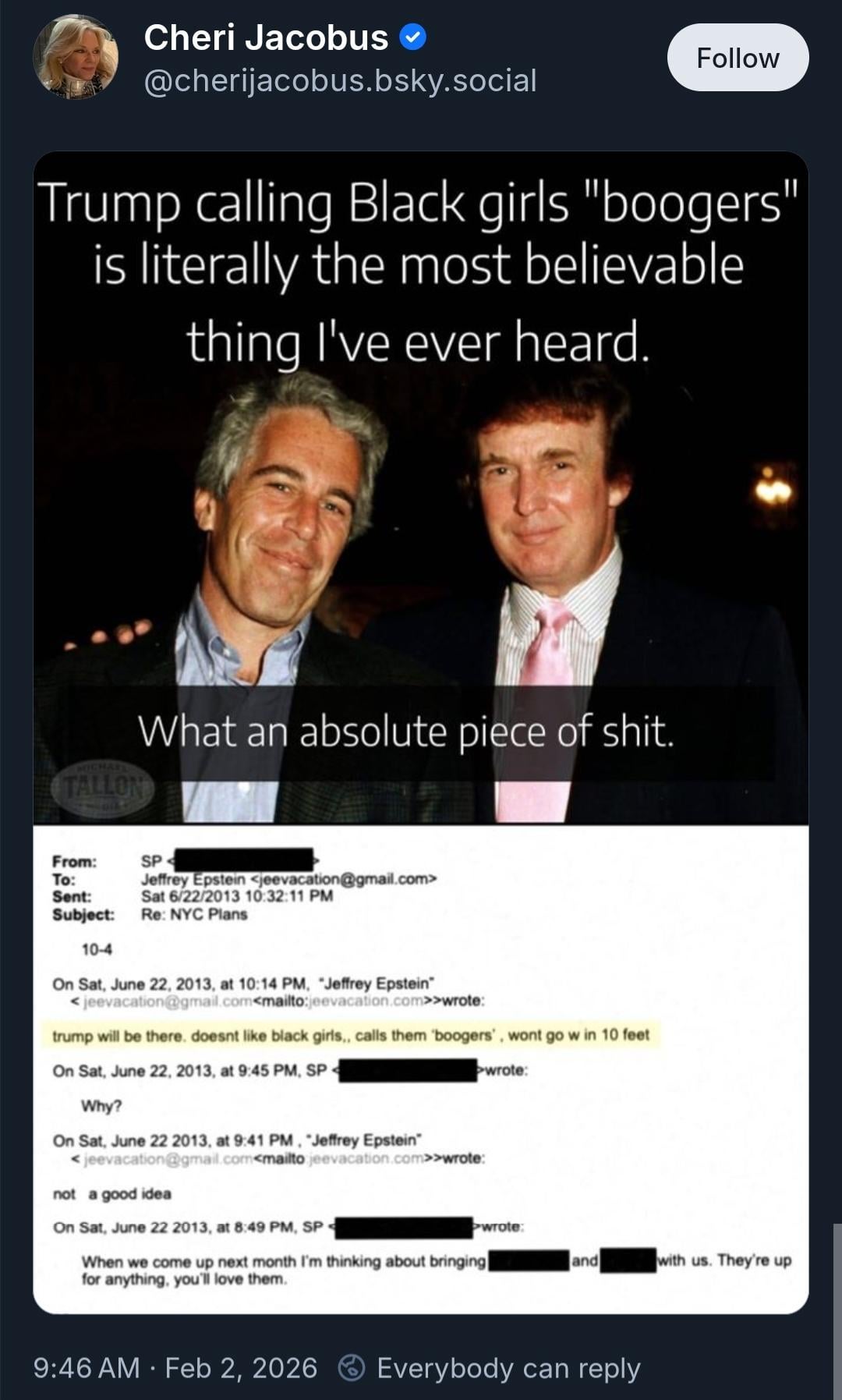 And **all** the racists who voted for him whop for joy and pump their fist in the air. Because that’s what he and his base are, racist to the core.