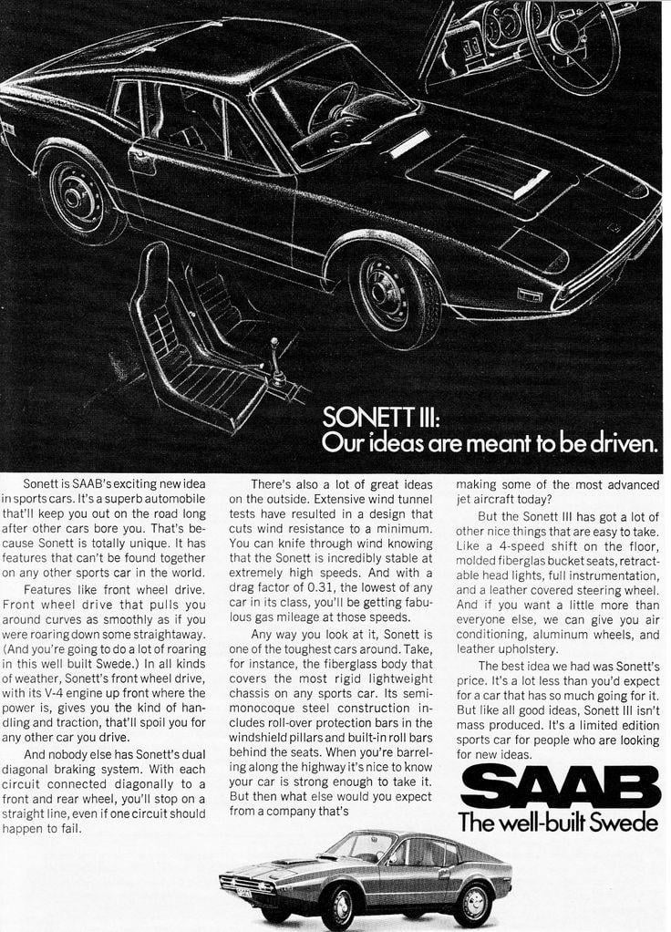 The Canadian built Bricklin (1974) looks a lot like it was inspired bu the Sonett. Sadly the Bricklin was garbage and the company folded in less than 2 years.