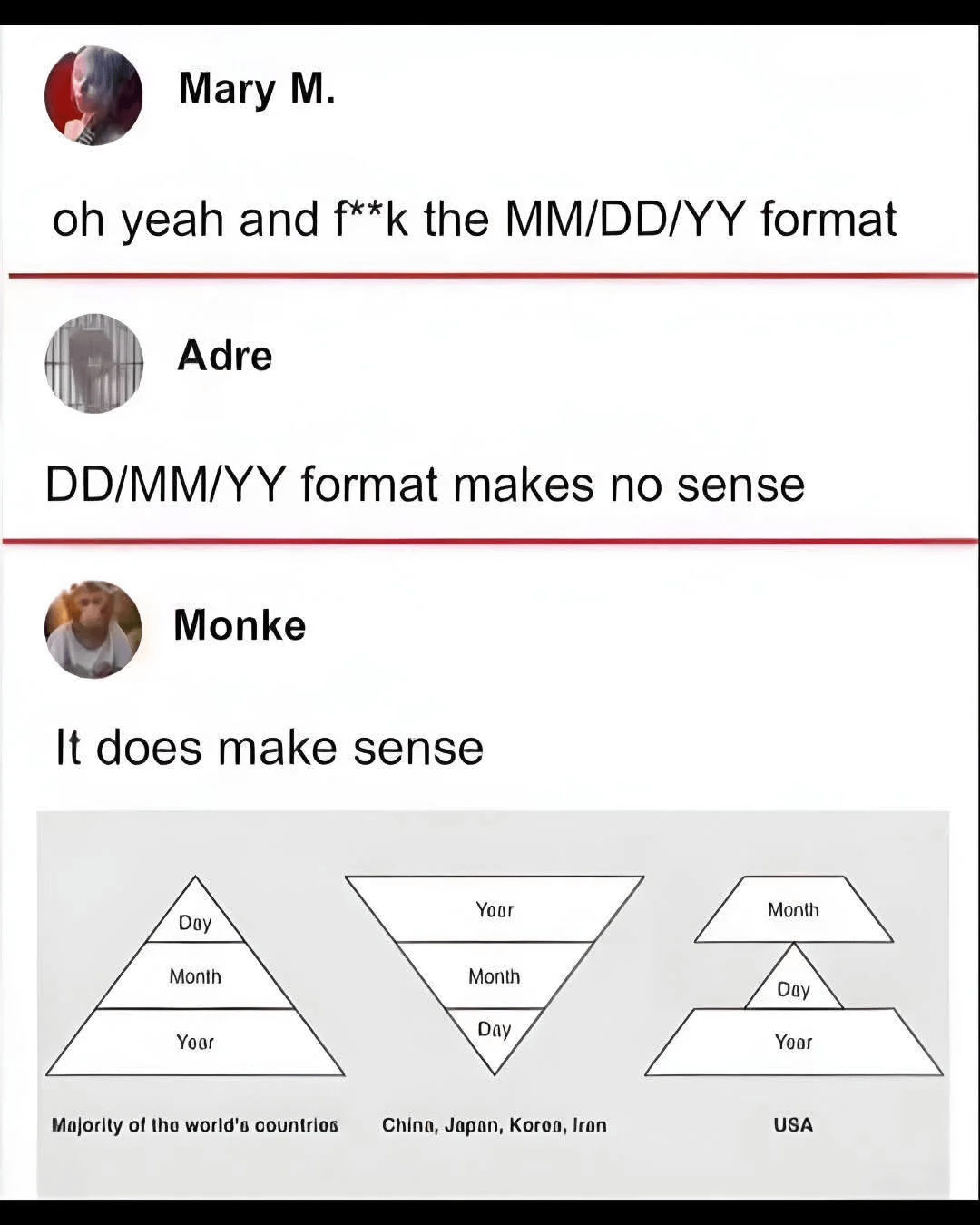 Mmhh… MM/DD/YY is better conversely, but not logically. If we sort time measures by how long a single unit lasts, we’d get Seconds:Minutes:Hours:Days:Months:Years. And tbf, logic is more universal that language.