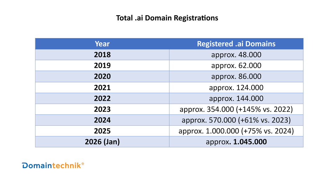 - Domain registrations: 107,603 (1 Dec 2022) → 1,045,963 (Jan 2026)