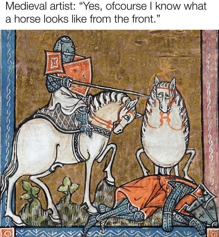 3. Reminder that most medieval illustrations aren’t from professional artists, but from monks who spent 90% of their time copying the bible and other manuscripts by hand. Not exactly an environment conducive to artistic improvement (doctrine also played a role in the art looking like that, but the point still stands).