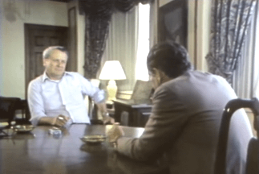 Ex-cop Louis Krause talks to a reporter for 60 Minutes about how he saw his partner, Thomas Grady, murder an unarmed black suspect in 1958. The murder was dismissed as justified until Krause confessed in 1979, saying that Grady had planted a knife on the victim’s body (Milwaukee, 1980) [841 x 564].