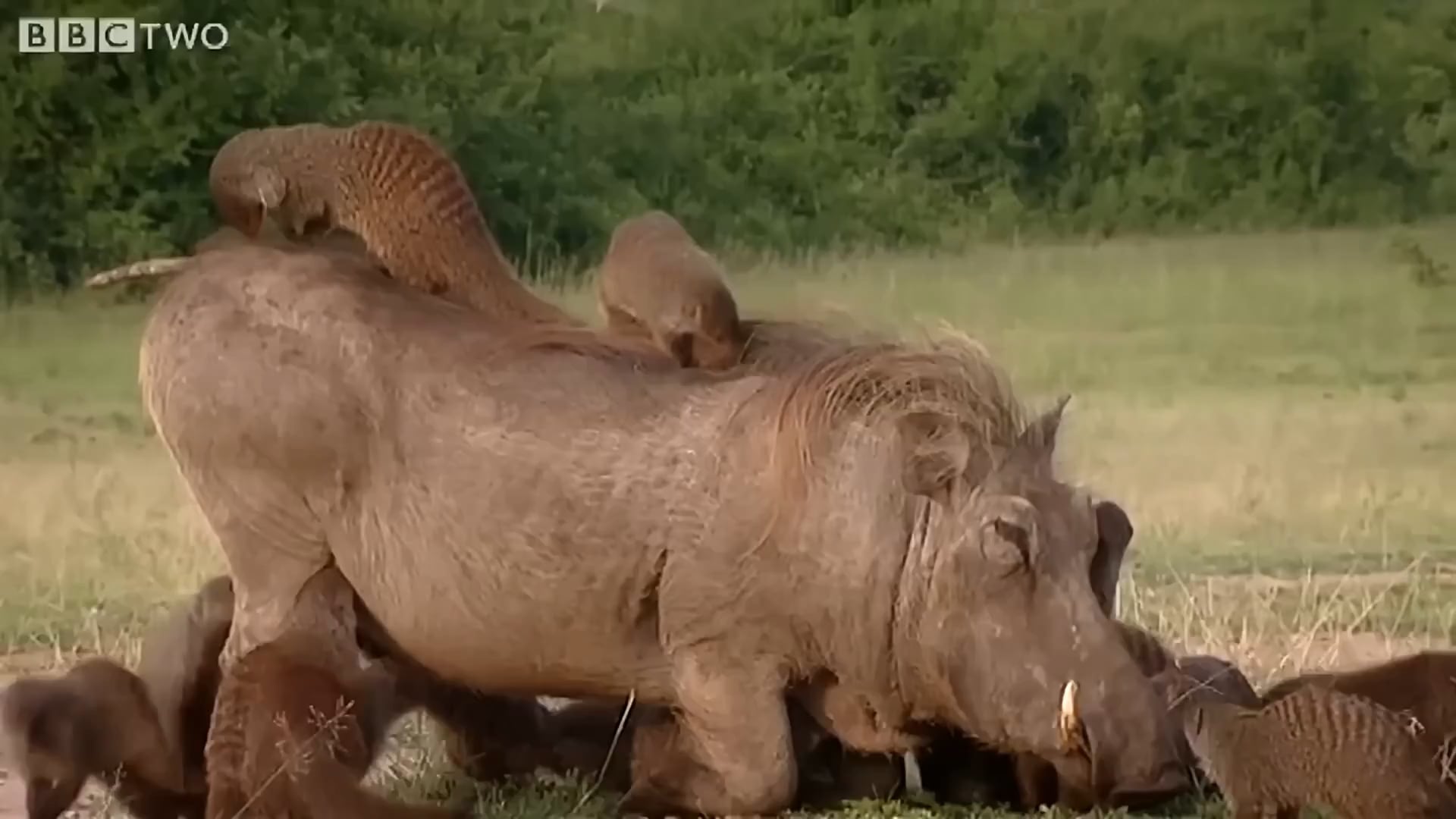 “Band of mongooses devour helpless warthog”