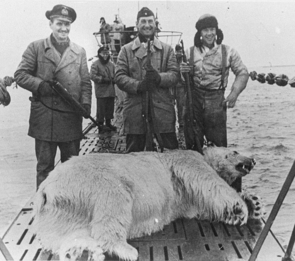 Sailors of the German submarine U-601 pose next to a dead polar bear in the Arctic Ocean, September 1943. [1025×908]