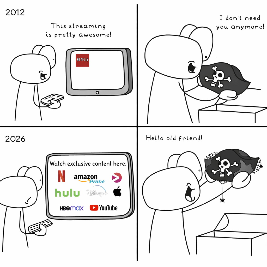 Pirating almost went completely away because streaming was cost effective and easy, now its expensive, complicated, ad ridden and sucks. they did this to them self’s TBH