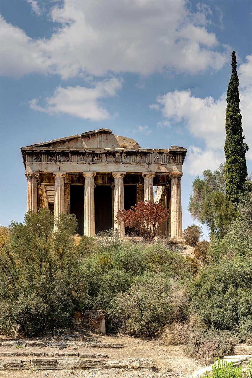 The Temple of Hephaestus (c. 430 BC), a Doric peripteral temple at the north-west side of the Agora of Athens, is one of the best-preserved Greek temples anywhere. It remains standing largely intact today. The building keeps the frieze, pronaos, cella and opisthodomos structures… [1280×753] [OC]