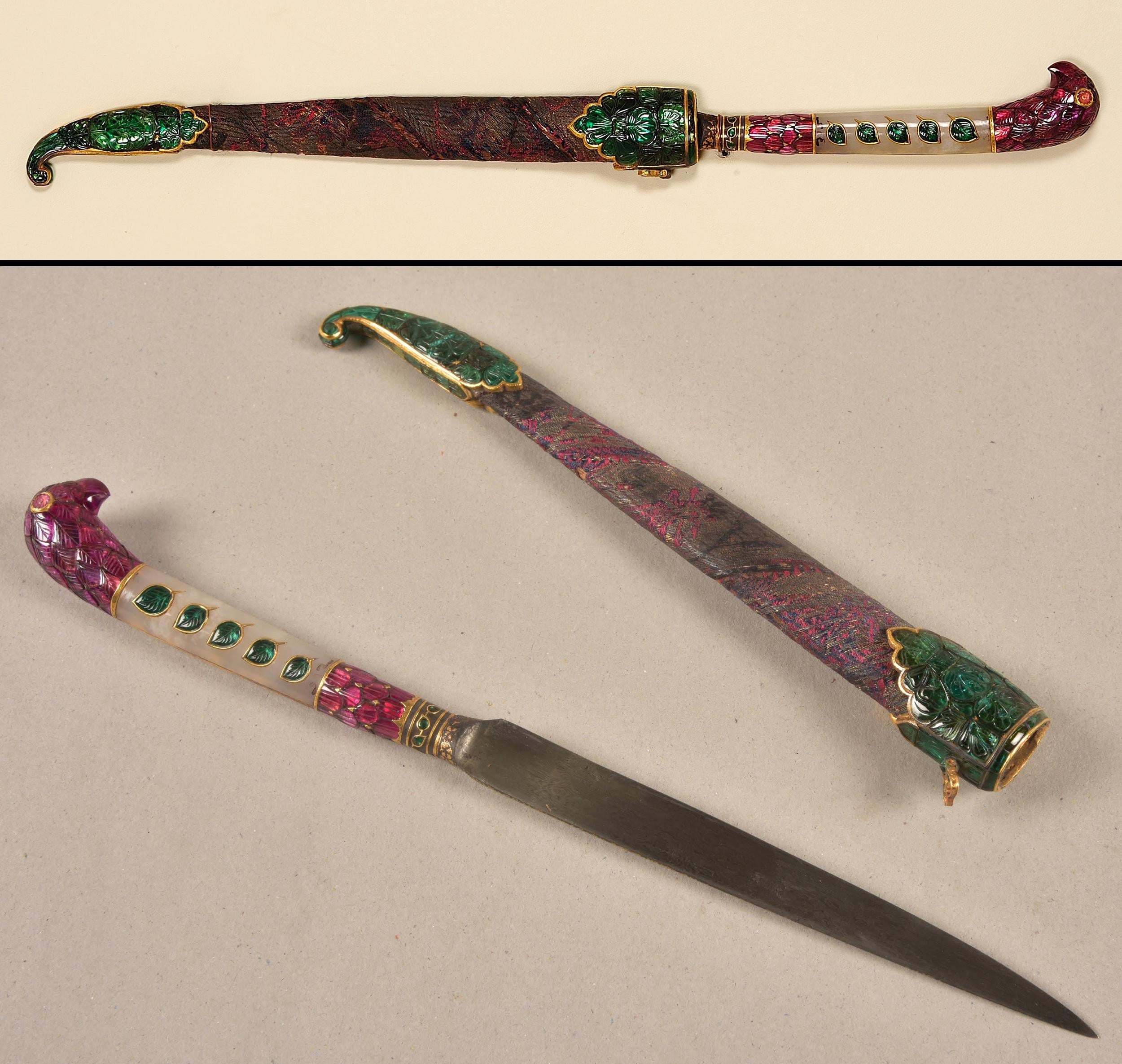 The fruit knife of queen Nur Jahan, emperor Jahangir’s 20th wife, with parrot’s head handle made of jade, ruby and emeralds. India, Mughal Empire, 17th century [2500×2370]