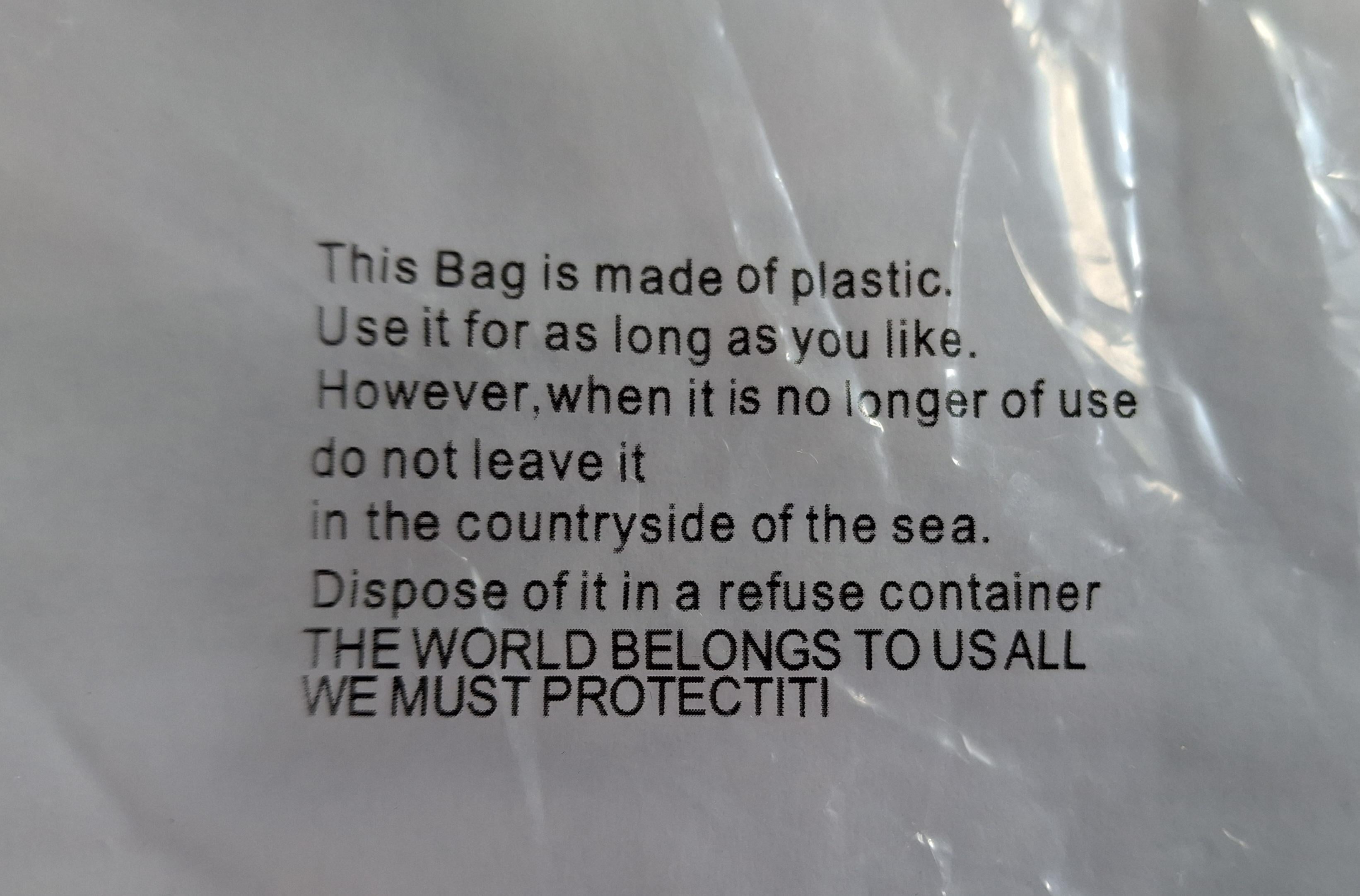 “This plastic bag was actually completely superfluous as the clothes it contained are made of polyester and you’ll launder the garment prior to wearing it anyway. This message was printed with toxic dye, but at least it was spell-checked.” <- fixed your headline for you. You’re welcome.