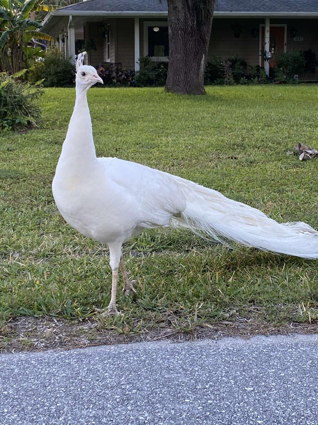 This entirely white peacock in my mom’s neighborhood