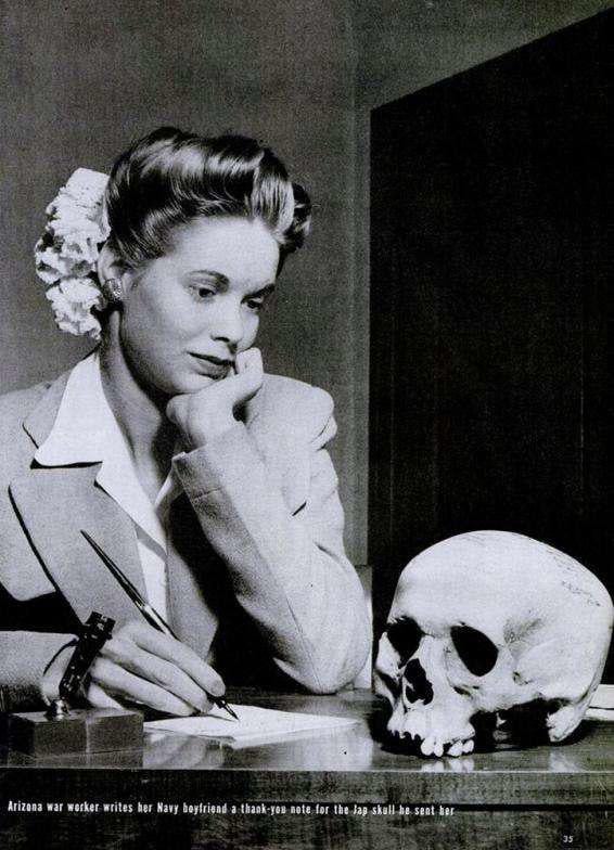 A bride who received a gift from her U.S. Marine fiancé containing the skull of a Japanese soldier he had killed writes him a letter of gratitude in response. The photo was published in Life magazine on May 22, 1944. [566×784]