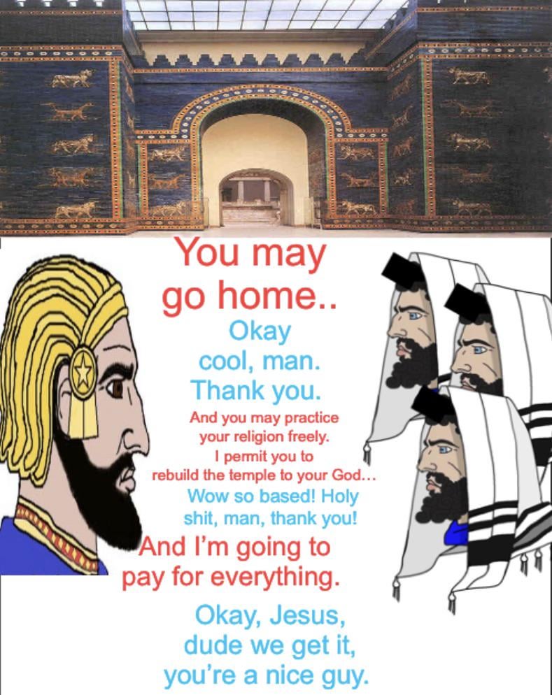 Cyrus (red) being a straight up homie to the Jews (blue)—how I imagine the conversation went. by jackt-up