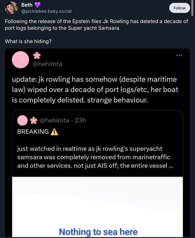 She’s spent years framing her TERF anti-trans bigotry as protecting women while docking her yacht on Epstein island. The irony is not even enjoyable, it’s just stunning. Every body is quoting George Carlin these days; it’s a big club and you ain’t in it.