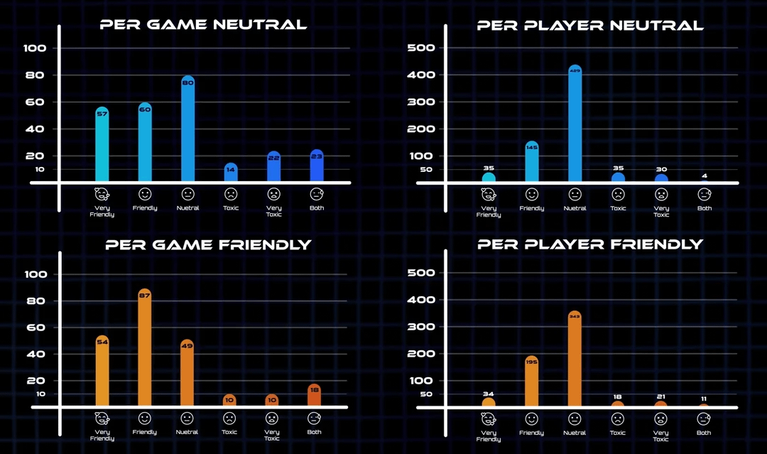 Each time a player acted in a way that could be considered inherently “Friendly” or “Toxic” that would be one ‘instance’ of that behavior happening. You only need one instance for the friendly or toxic categories, and at least one instance of each behavior type is required to be placed in the “both” category (even if a player may lean more towards one type of behavior). For the “Very Toxic” or “Very Friendly” categories, at least 4 separate instances of that behavior or one instance of a behavior that is already so extreme that it bypasses the “4 separate instances” requirement is needed. This is definitely the vaguest definition of the categories I’ve given, so I’ll try to give an approximate “bare minimum” requirement to be considered into the extreme categories off one instance. For the Very Toxic category, I would say that telling someone they’re terrible at the game or calling them trash would meet the criteria, and for the Very Friendly category, telling someone that they are excellent at the game would meet the criteria. It’s really that simple, if I consider an instance to be about on that level or greater, then it will be immediately categorized into the extreme categories without needing any other instances to qualify.