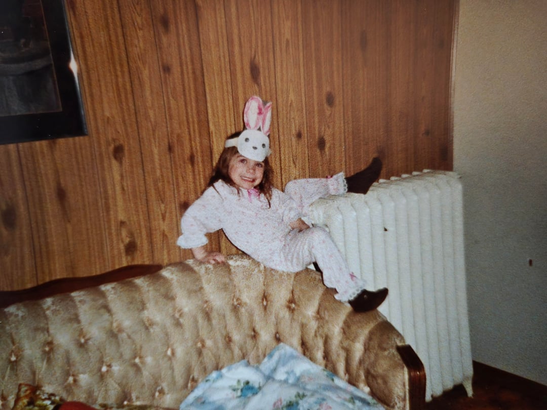 First picture has wood panel walls, giant painted radiator, and classic couch.