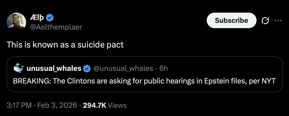 I’m pretty sure the Clintons are just going to be open about this. It’s obvious both had an arrangement with outside relationships which is not even a big deal anymore. Probably if they open up about that, then no one will give a fuck about them anymore. This is well distanced from Trump having been a protagonist in the Epstein infrastructure and a supplier and customer. They had fucking breeding farms. Literal breeding farms of teenaged girls getting pregnant with the babies being taken from the immediately with no idea on if they were killed or sold or allowed to grow up to be new workers.
