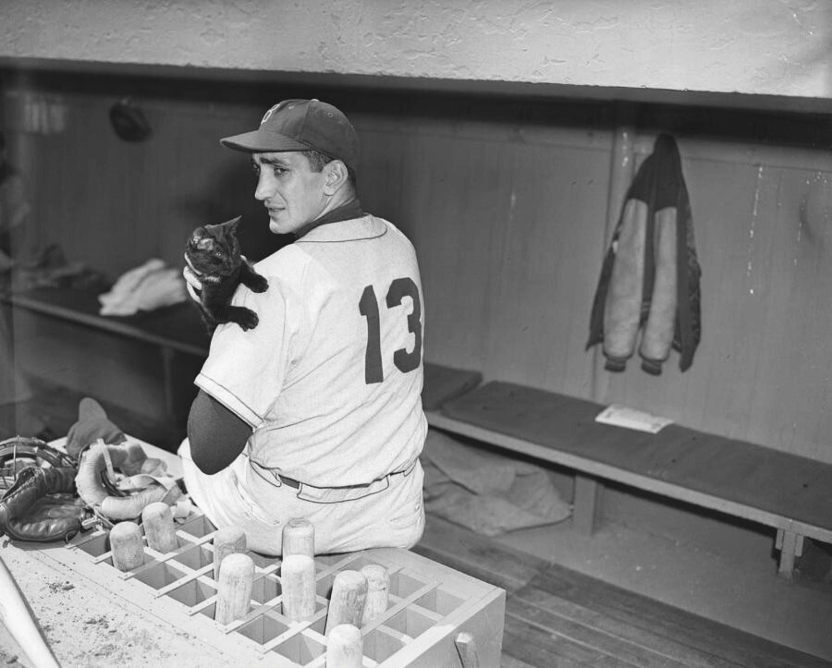 Brooklyn Dodgers pitcher Ralph Branca holding his lucky black cat in the dugout on Friday the 13th, before beating the Yankees 7-6. Ebbets Field, April 13, 1951. [1688×1356]