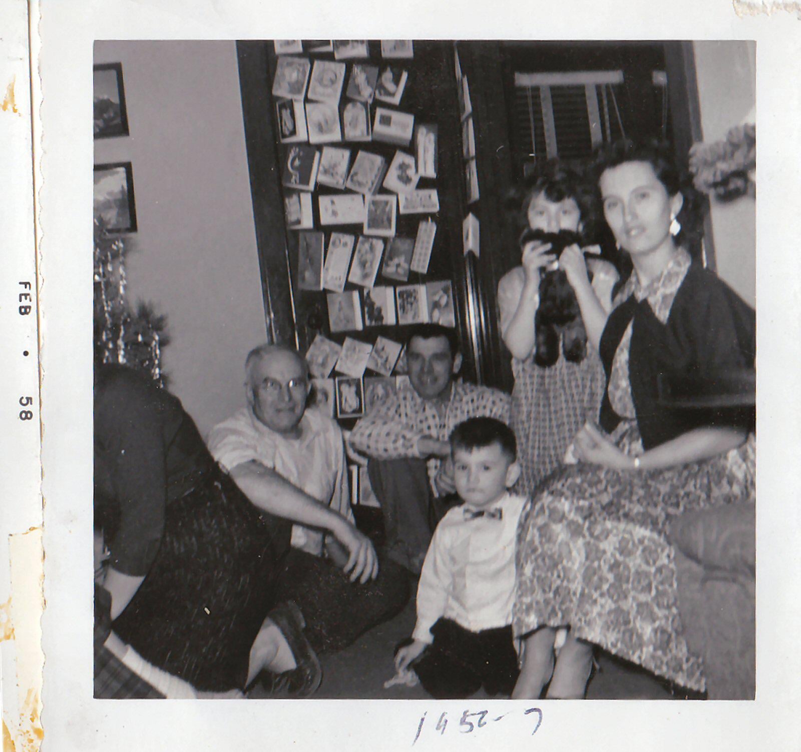 Christmas Eve 1957 at the grandparents. L-R Grandpa, my dad, me in the bow tie, sister with her teddy bear and my Mom who just turned 100 this past November.