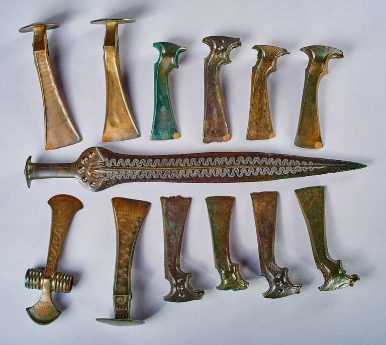 A bronze hoard with sword and axes, from Hajdúsámson-Hegedűs-hegy in Hungary. 1700-1600 BCE, now housed at the Déri Museum [768×687] by Fuckoff555