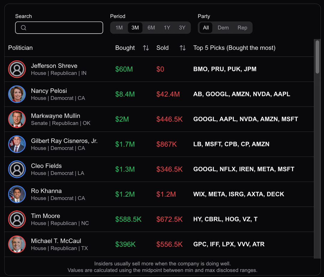 - Top buyers: Jefferson Shreve from Reps (+$60M), Nancy Pelosi from Dems (+8.4M)