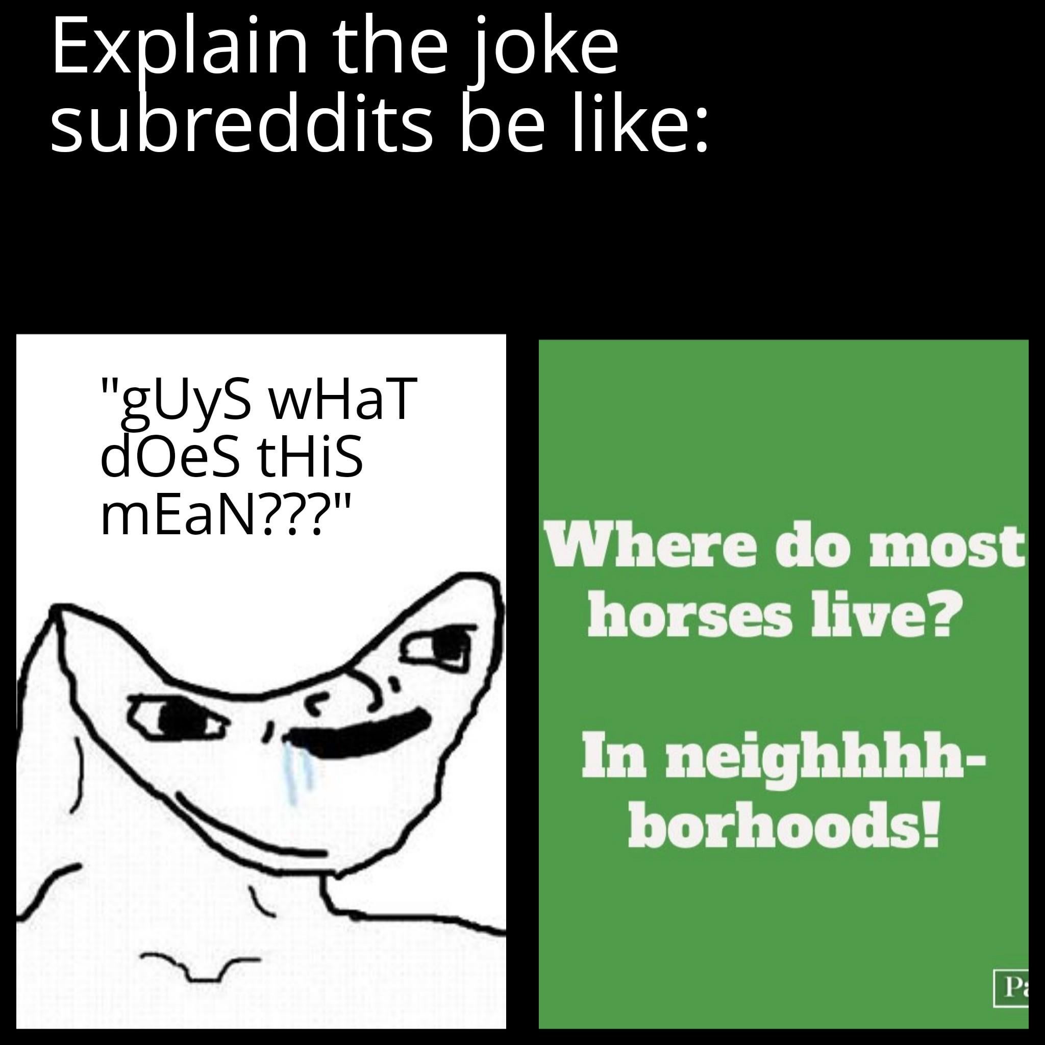 I realize this is meant to be a joke, but this is also a genuine question for anyone who’s not a native English speaker. “Neigh” is the sound horses make in English. It’s called an onomatopoeia. It’s a word used to describe sound. But in Russian for example they go “i-go-go”. So if you told a Russian person this joke it’s entirely possible they will stare at you blankly not understanding why horses live in the suburbs.