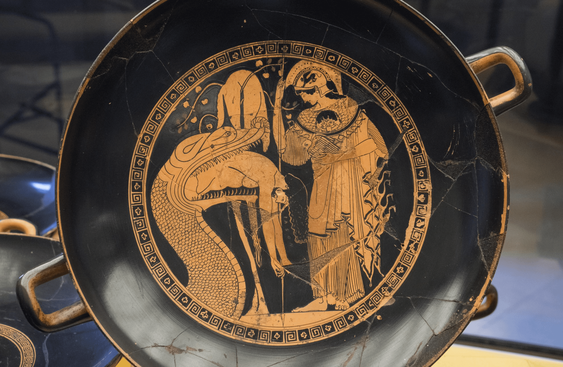 Jason being regurgitated by the Colchian dragon. The Golden Fleece hanging on the tree; Athena stands to the right – Red-figured kylix – Attributed to Douris, one of the Attic painters – c. 480–470 BC – Vatican Museums [1883×1228]
