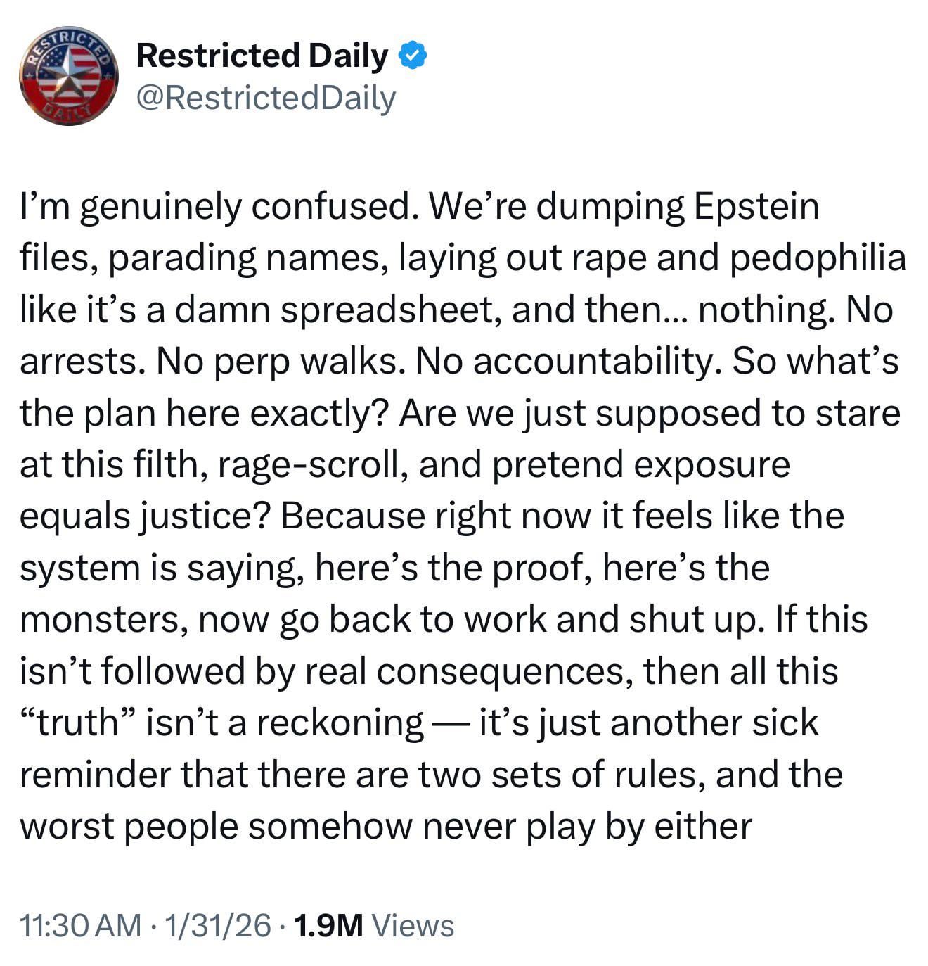 People understand that the DoJ is infested with Epstein associates right? There won’t be any charges from the fed.