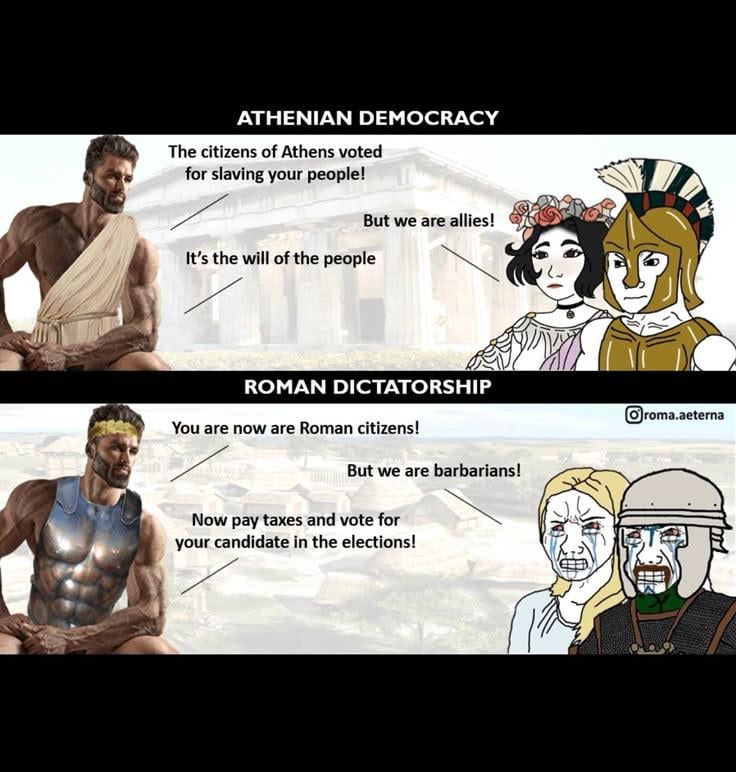 Roman Senatorial Class: We fabricated a claim that your tribe thousands of miles away, that the smelly plebs never heard of, is a threat to Rome itself. We will now systematically slaughter, rape and enslave your peoples because you’re barbarians and deserve to rot. In hopes that the plebs will forget about inflated grain prices and the fact we keep killing everyone trying to help them and started planting people amongst them that are helping us get richer. All roads lead to Rome blah, blah, blah. They’re not getting that god damn land reform passed.
