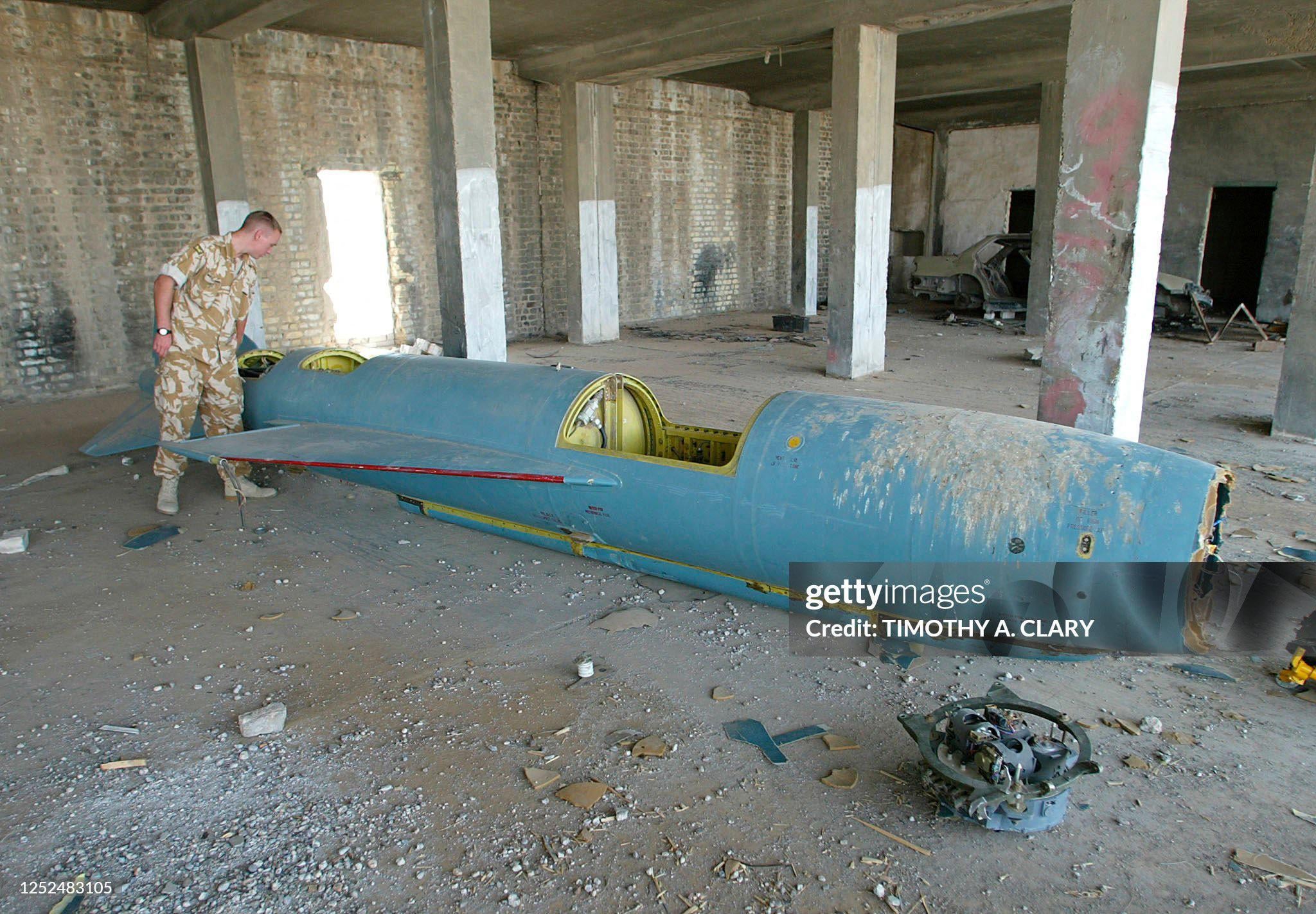 Soldier from the British Army, looking at a dismantled Chinese Silkworm (SY) anti-ship cruise missile (ASCM), formerly belonging to the Iraqi Armed Forces, in the city of Basra: following the U.S. military-led invasion of Iraq, c. May 2003. [2048 x 1423]