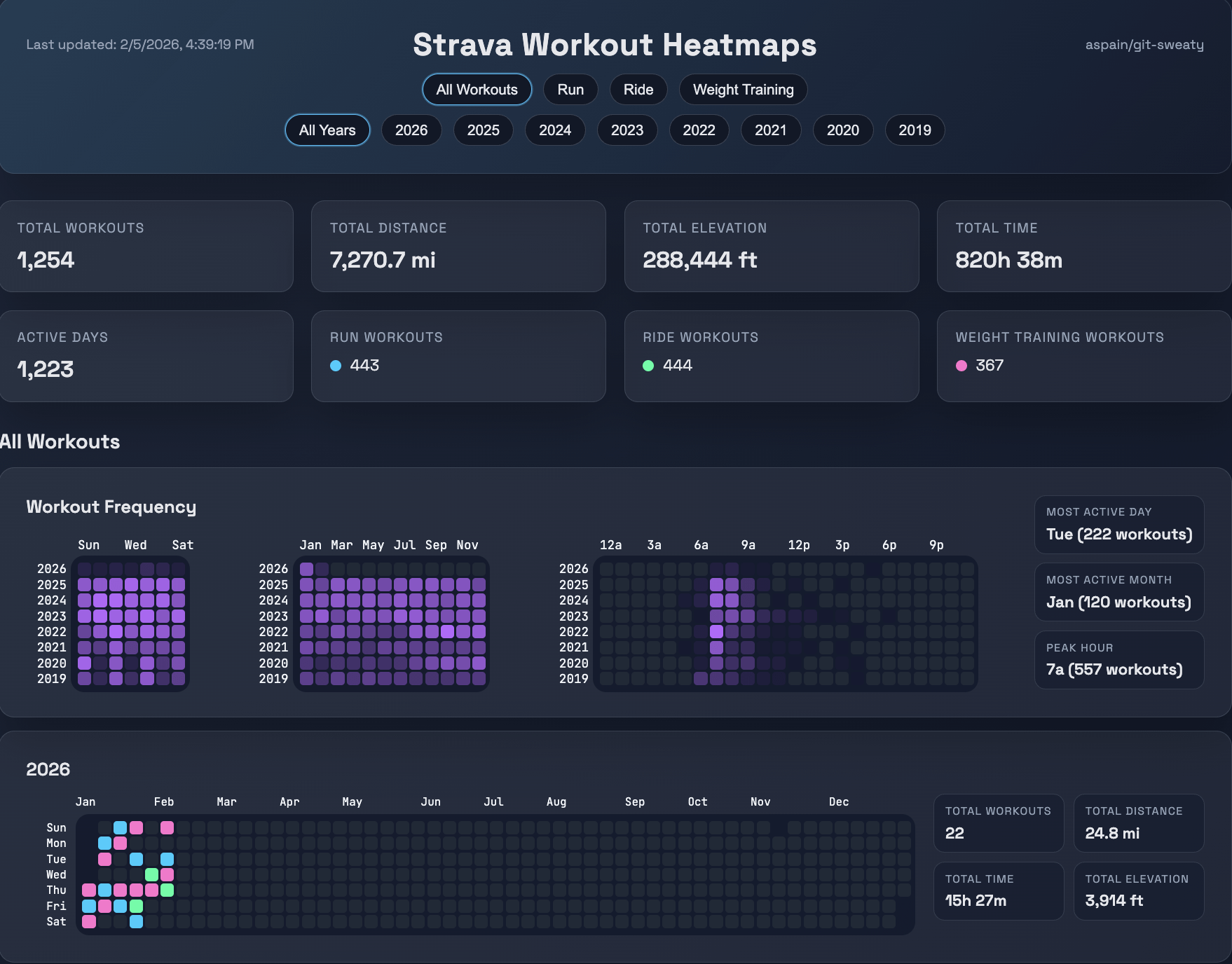 I wanted to play around with some of my strava data and made a github contributions style dashboard to visualize some of my workout trends.