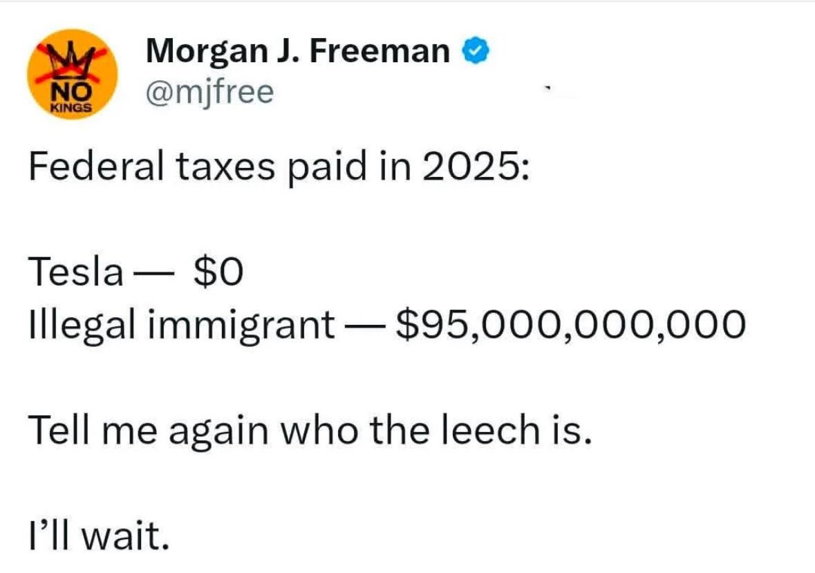 Tesla’s tax paid would actually be significantly negative if you consider government subsidies provided to them. Tesla is a net negative for literally every single American except 1, and he’s one of those dreaded immigrants.
