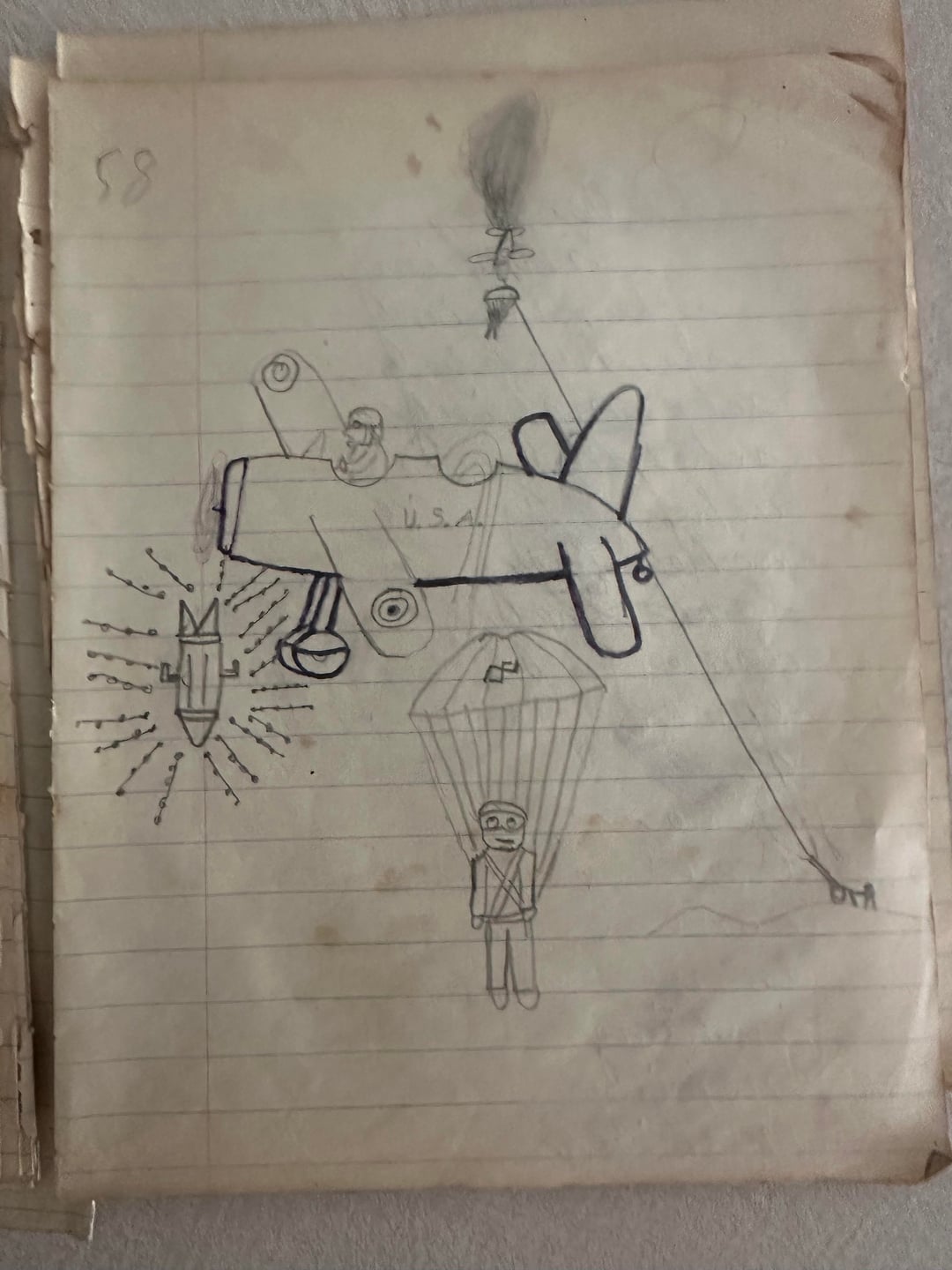 Doodles by my dad (aged 9 or 10) in his school notebook, ca. 1942 or ‘43