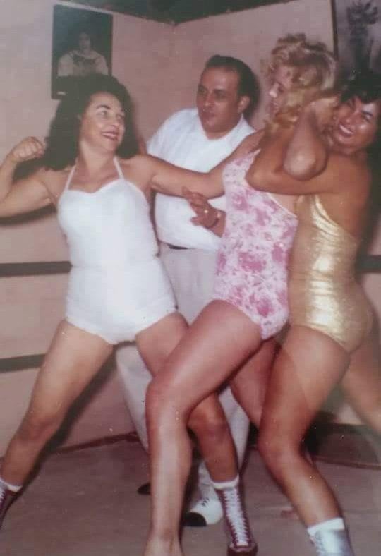 WWE Hall of Famer The Fabulous Moolah (left), her wrestling and country music mega-promoter husband Buddy Lee (behind), his mistress/future wife and founder of Buddy Lee Attractions, wrestler Rita Cortez (right), training my wife’s grandmother, the statuesque blonde Vicki Page (center) in 1961.