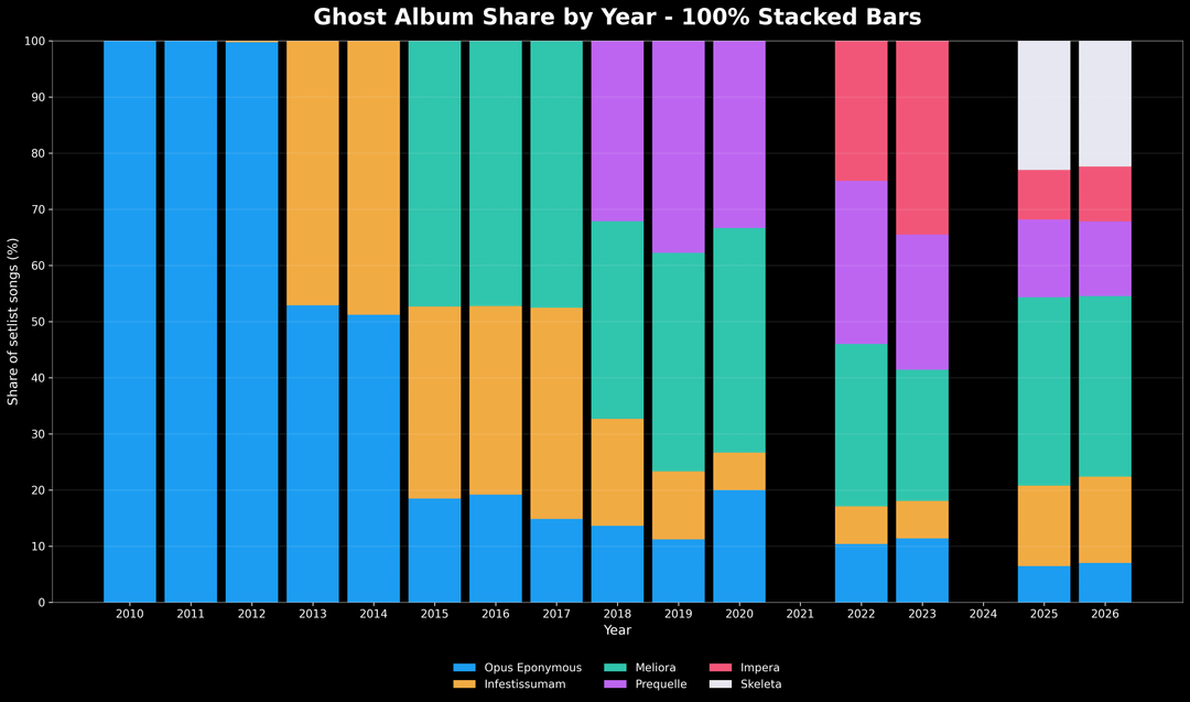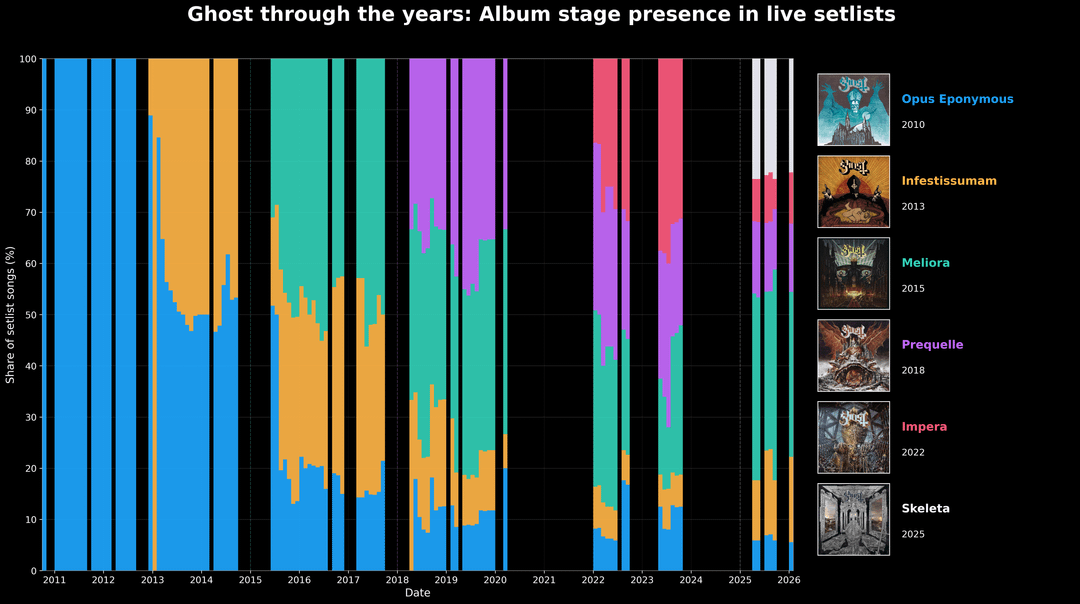 I wanted to share some cool data about my favorite rock band, Ghost. I was curious to see how their albums trended over time in the live shows, so I put together a Python script to scrape data off setlist.fm and compiled the statistics into some nice graphics. Setlist.fm presents this information, but not in a very pleasing manner and I was interseted in playing with the data myself. Some other facts I came across: