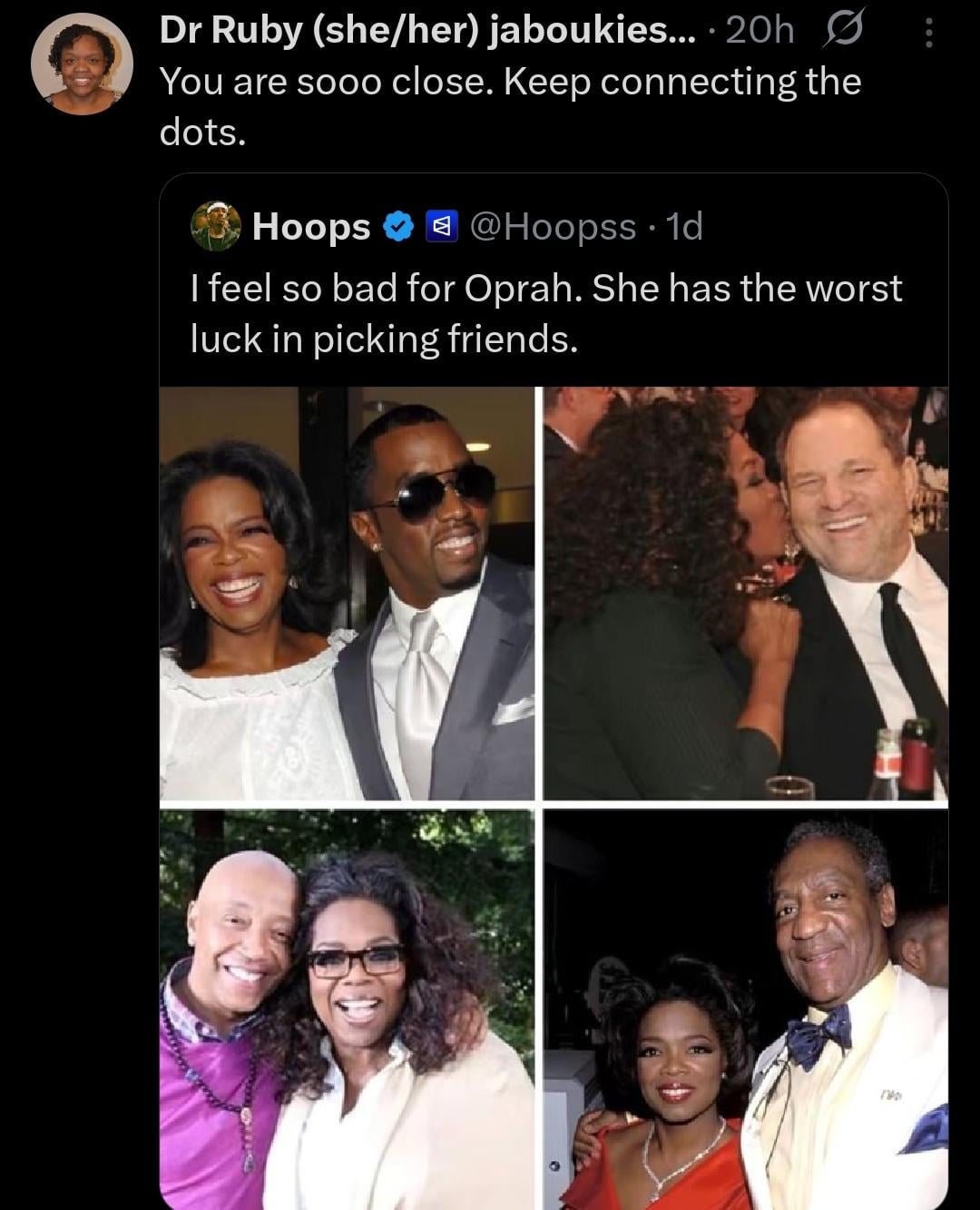 10. You can probably find Oprah in a picture with every celebrity that was famous between 1990 and 2015. There’s plenty of ppl with substantial evidence that they need to be prosecuted please focus on facts and evidence.