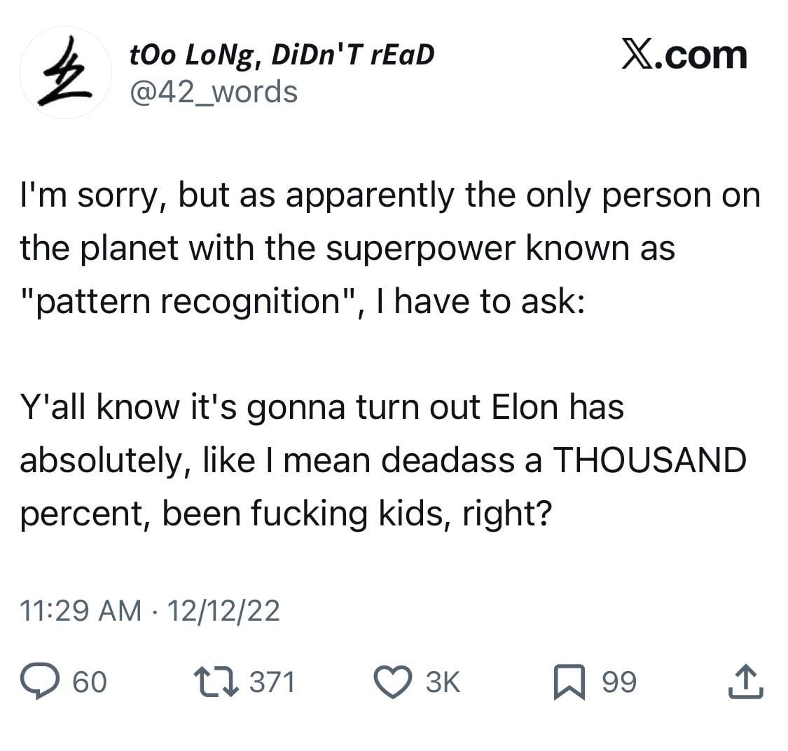 Yeah honestly as soon as the “p*do guy” thing during the rescue of those boys, I knew he was one of those