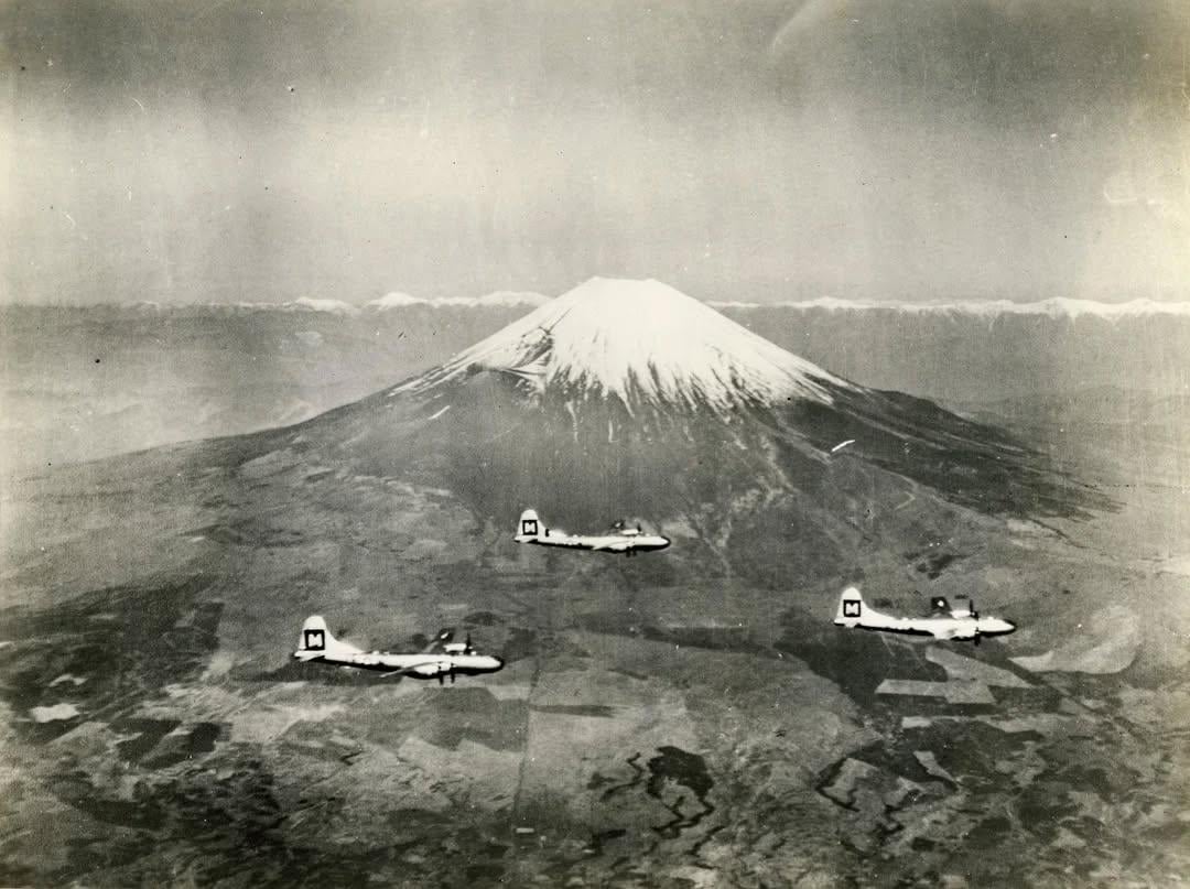 Photograph of B-29 Superfortress bombers from the USAF’s 19th Bombardment Group flying over Mount Fuji as they approach their final destination of Tokyo. (1945, World War II)[1080 × 807 ]